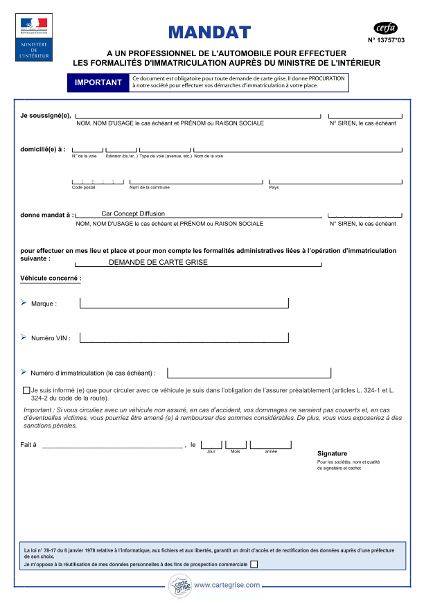 Téléchargez gratuitement le document PDF pour mandater le certificat d’immatriculation de votre véhicule. Facilitez vos formalités administratives avec ce modèle complet.