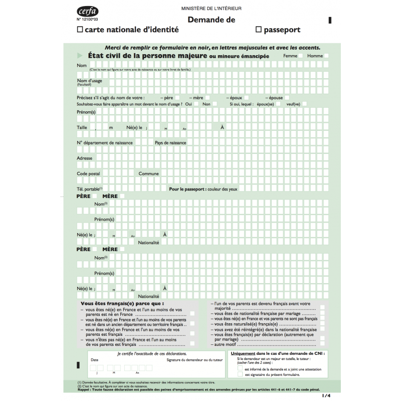 Téléchargez gratuitement le formulaire Cerfa PDF pour la carte d’identité nationale. Complétez, signez et joignez-le à votre demande dans les 90 jours suivant l’expiration du délai.