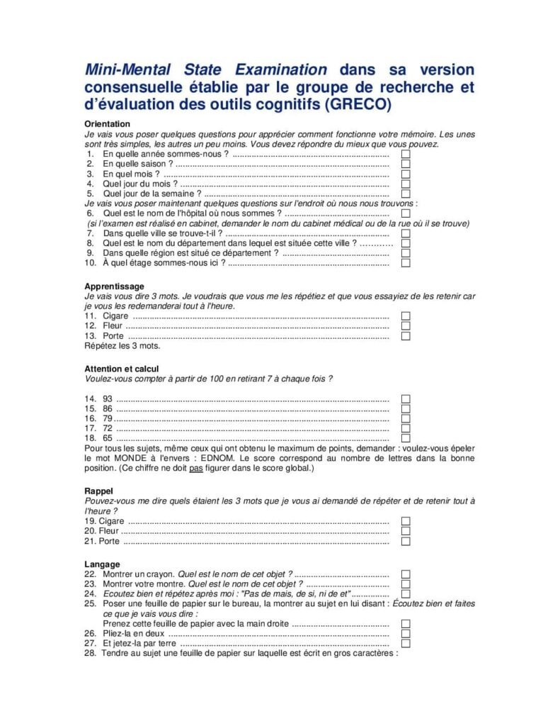 Téléchargez gratuitement le Test de Folstein (PDF) pour évaluer les fonctions cognitives. Notez que ce test ne peut établir un diagnostic étiologique. Obtenez-le maintenant sur notre site.